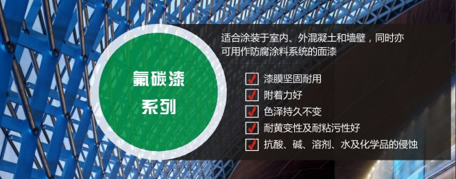 產(chǎn)品概述: 氟碳面漆的組成 氟碳面漆是以高級氟碳樹脂、特種樹脂、主要成膜物質(zhì)的雙組份自干涂料。由于氟樹脂涂料由于引入的氟元素電負(fù)性大,碳氟鍵能強(qiáng),具有特別優(yōu)越的各項(xiàng)性能。耐候性、耐熱性、耐低溫性、耐化學(xué)藥品性,而且具有獨(dú)特的不粘性和低磨擦性。 氟碳面漆的技術(shù)指標(biāo) 漆膜外觀:漆膜平整光滑,顏色符合標(biāo)準(zhǔn)樣板 細(xì) 度:≤20μm, 金屬面漆、 啞光不作要求 干燥時間:標(biāo)準(zhǔn)厚度單涂層,25℃, 表干≤2h,實(shí)干≤48h 光 澤:(60°)亮光:≥90°, 啞光:商定(20°~ 80°) 鉛筆硬度:≥2H 附 著 力:≤1(劃格法,級) 杯突試驗(yàn):≥4mm 彎曲實(shí)驗(yàn):≤2mm 耐 水 性:240h,不起泡,不起皺,不失光 耐汽油性:24h,不起泡,不起皺,不失光 耐 侯 性:人工加速老化:1000h; 失光≤1,粉化≤1,龜裂≤1